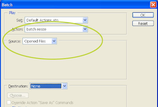 - Make sure Action : batch resize dan Source : Opened Files (file-file yang sudah di buka terlebih dahulu)